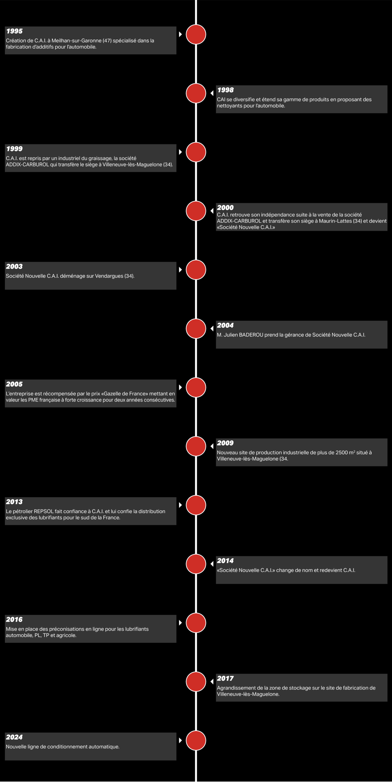 Depuis plus de 25 ans, C.A.I., un industriel indépendant spécialisé dans la conception et la fabrication d’additifs et de lubrifiants, met son expérience, son savoir-faire et ses compétences à votre service.