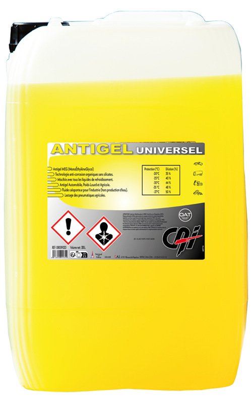 Produit concentré à base de mono-éthylène-glycol inhibé. Il respecte les spécifications de la norme NFR 16-601. Il protège  jusqu’à une température de -37°C. D’autre part, la température de protection que procure ce produit est relative à la dilution. Nous vous recommandons  d’être attentif aux préconisations ci dessous. et nous vous conseillons de le diluer dans de l’eau déminéralisée disponible chez CAI (référence 08003xxx).